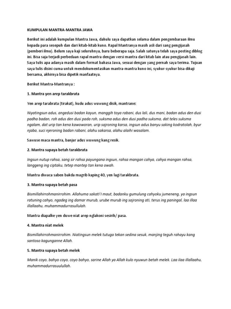 21 Kumpulan Mantra Jawa Paling Dicari 2018 Berikut ini adalah kumpulan Mantra Jawayang saya dapatkan dari para sesepuh dan dari kitab-kitab kuno. 632018 Kitab jawa kuno pdf. Berikut ini ada 5 mantra kejawen kuno yang terbukti ampuh untuk merubah hidup anda jika anda sedang mencari mantra kejawen seperti ta.