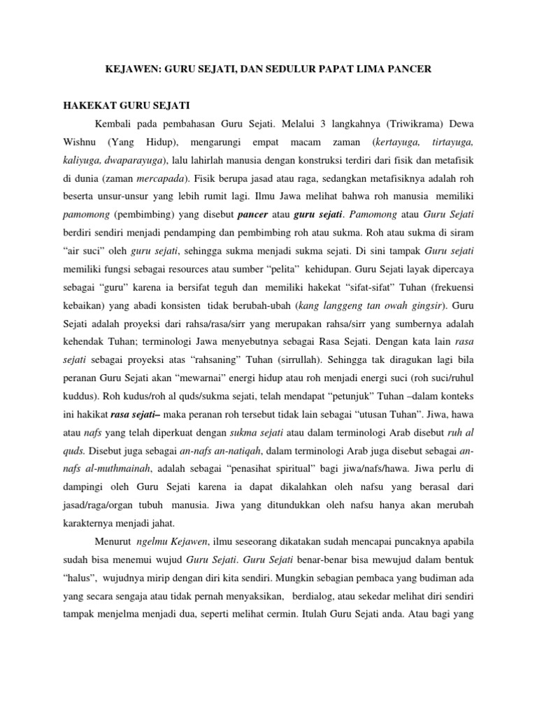 Mengukum demi kebaikan itu hanya ada dalam sudut pandang pikiran Manusia sementara Tuhan Yang Maha Esa bukanlah manusia. Mantra dan Amalan Guru Sejati Menurut Ilmu Kejawen ilmu seseorang dikatakan sudah mencapai puncaknya apabila sudah mampu menemui wujud Guru Sejati. Namun sebelumnya harap dimaklumi jika penjabaran saya jauh dari keinginan.